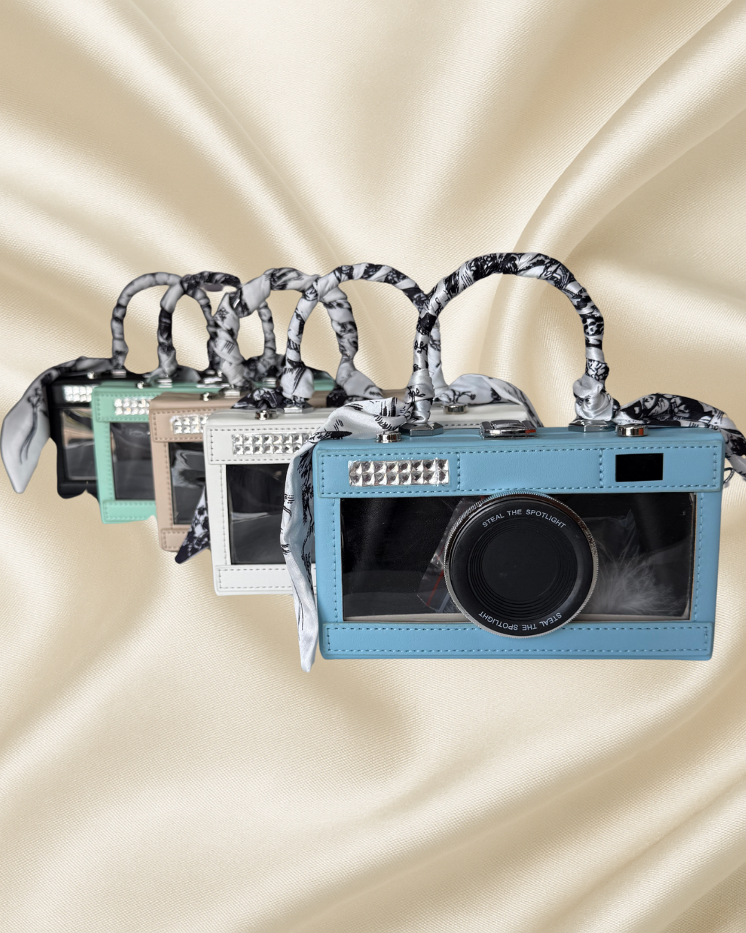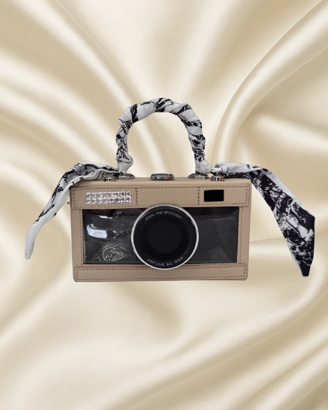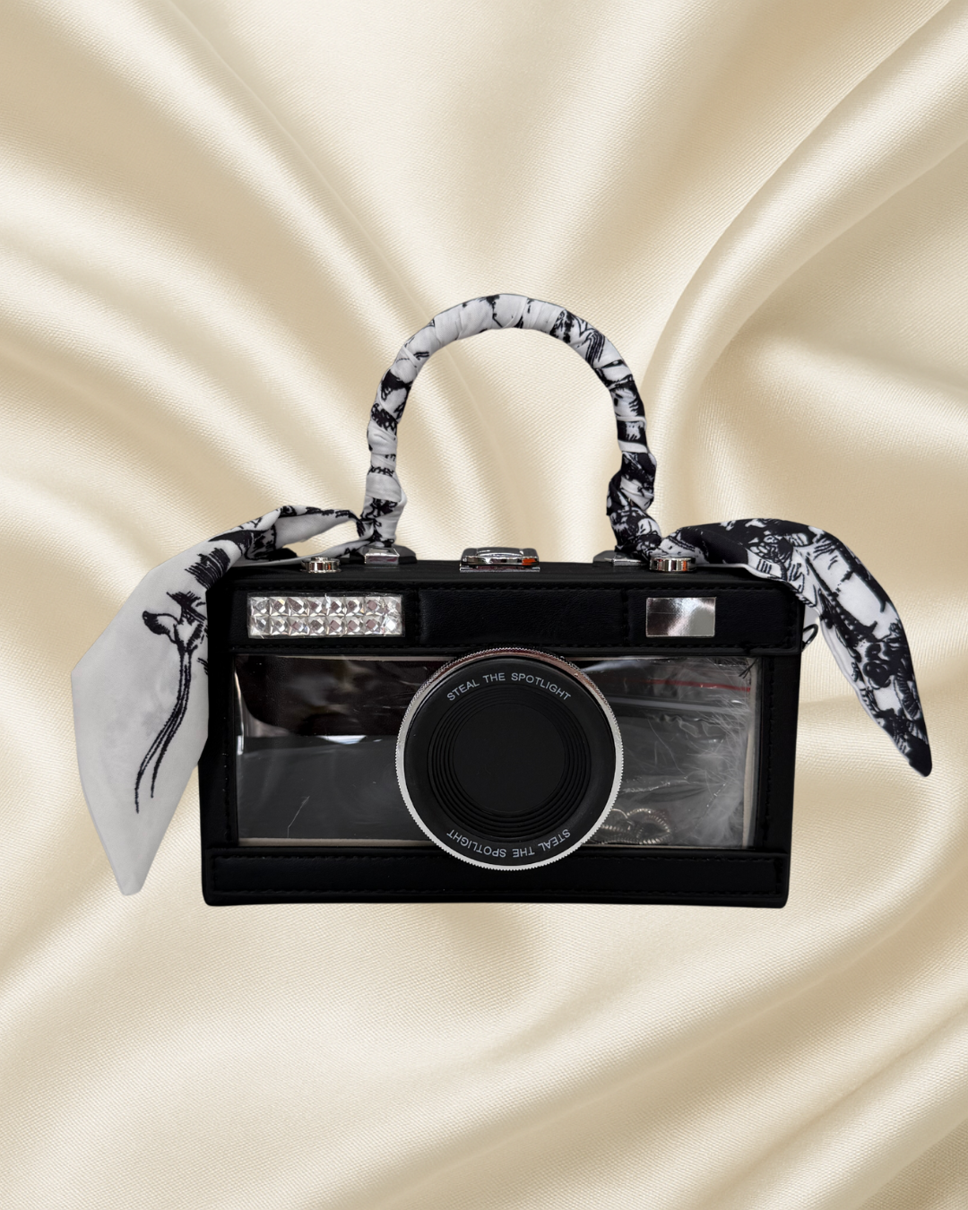 Cartera estilo cámara fotográfica, moderna y divertida con asa forrada en pañuelo estampado. Su diseño estructurado con detalles metálicos y ventanilla frontal le da un look único que roba miradas.