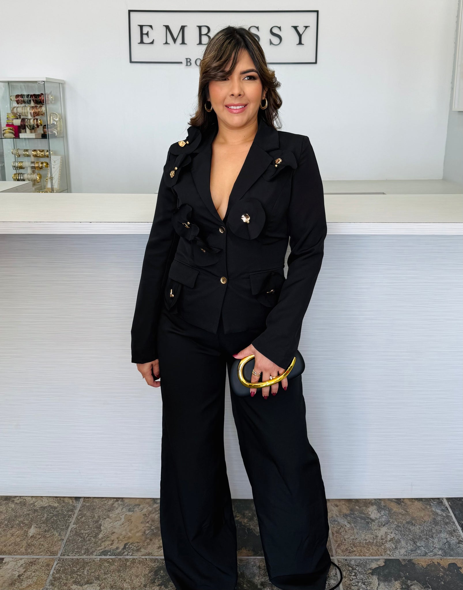 Este set de dos piezas incluye un blazer estructurado con detalles únicos de flores en 3D y botones dorados que le aportan un toque sofisticado y femenino. El pantalón recto estiliza la silueta y brinda porte en cada paso.