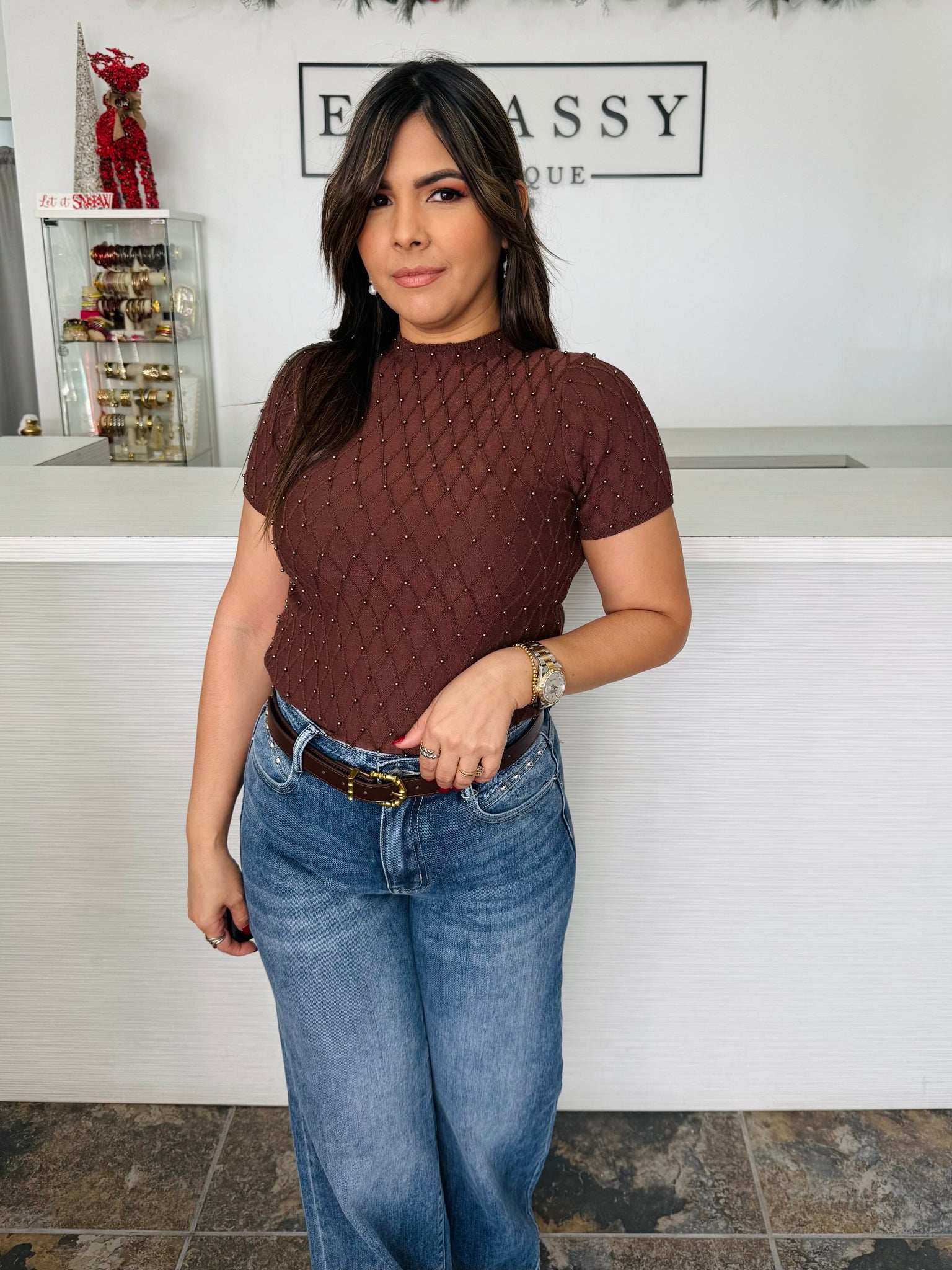Top en tono brown con diseño tipo mesh y detalle de perlitas en patrón romboidal. Suave, cómoda y de ajuste precioso al cuerpo, ideal para crear looks chic sin esfuerzo. Perfecta para combinar con mahones, pantalones claros o faldas para un estilo moderno y delicado.