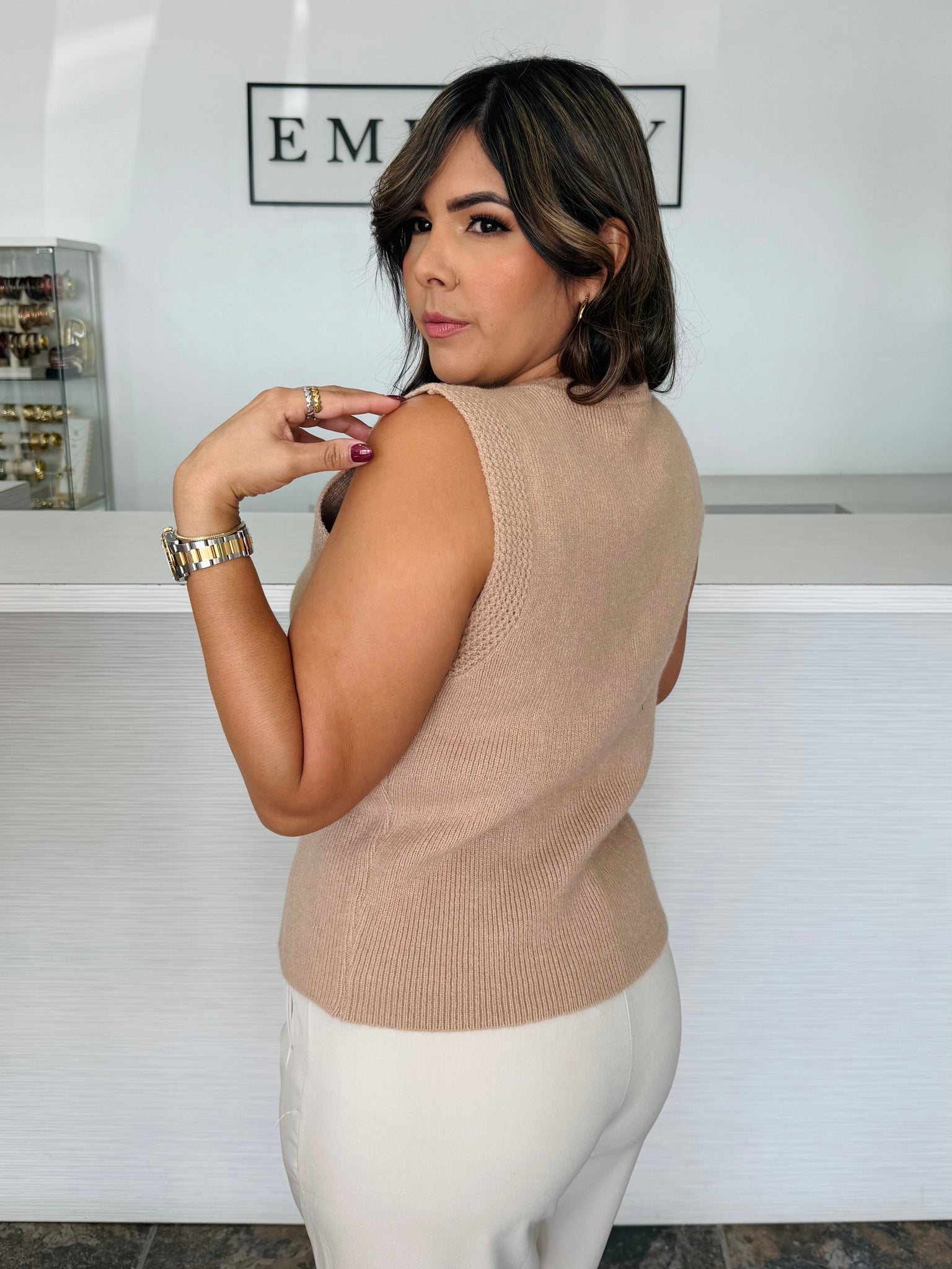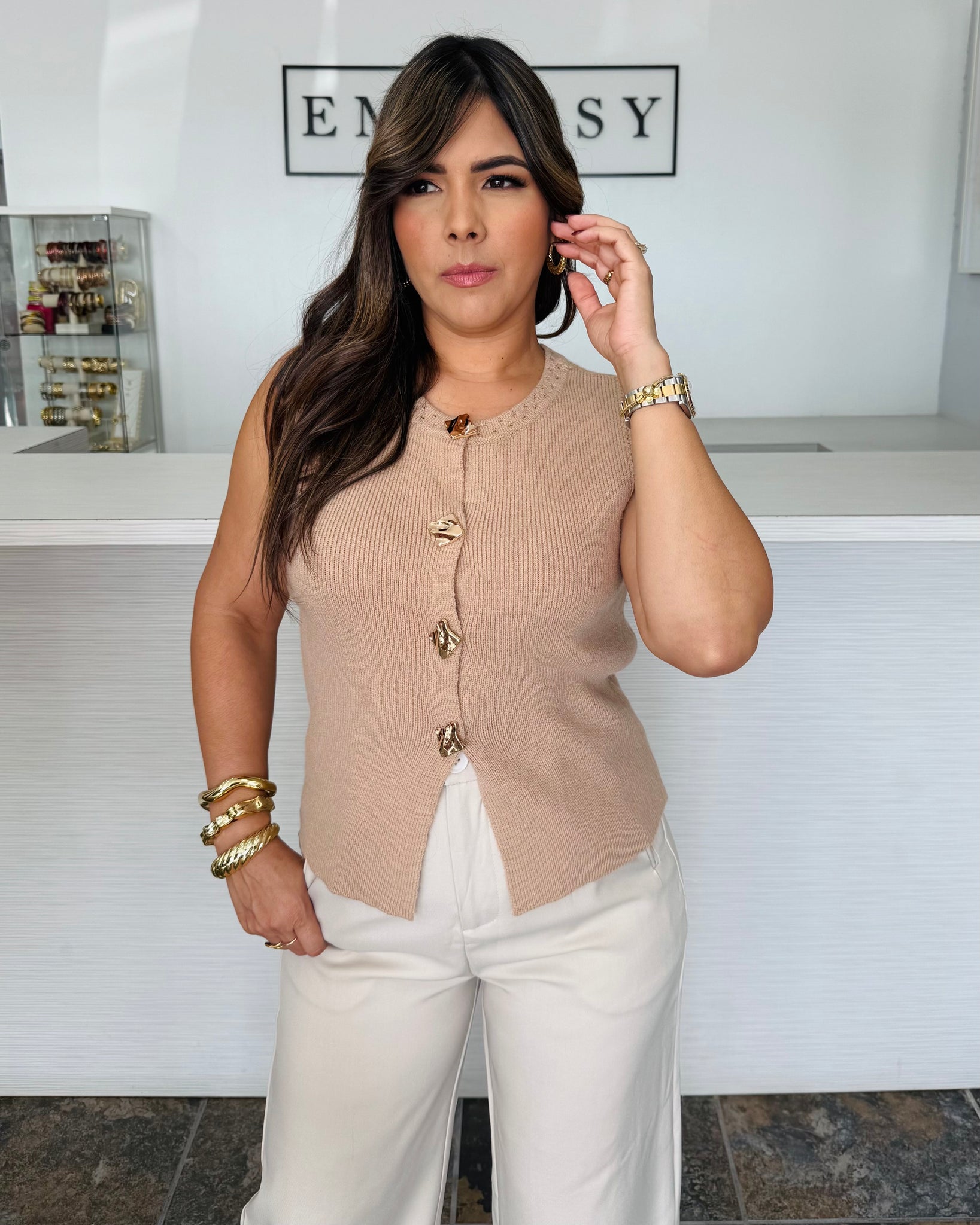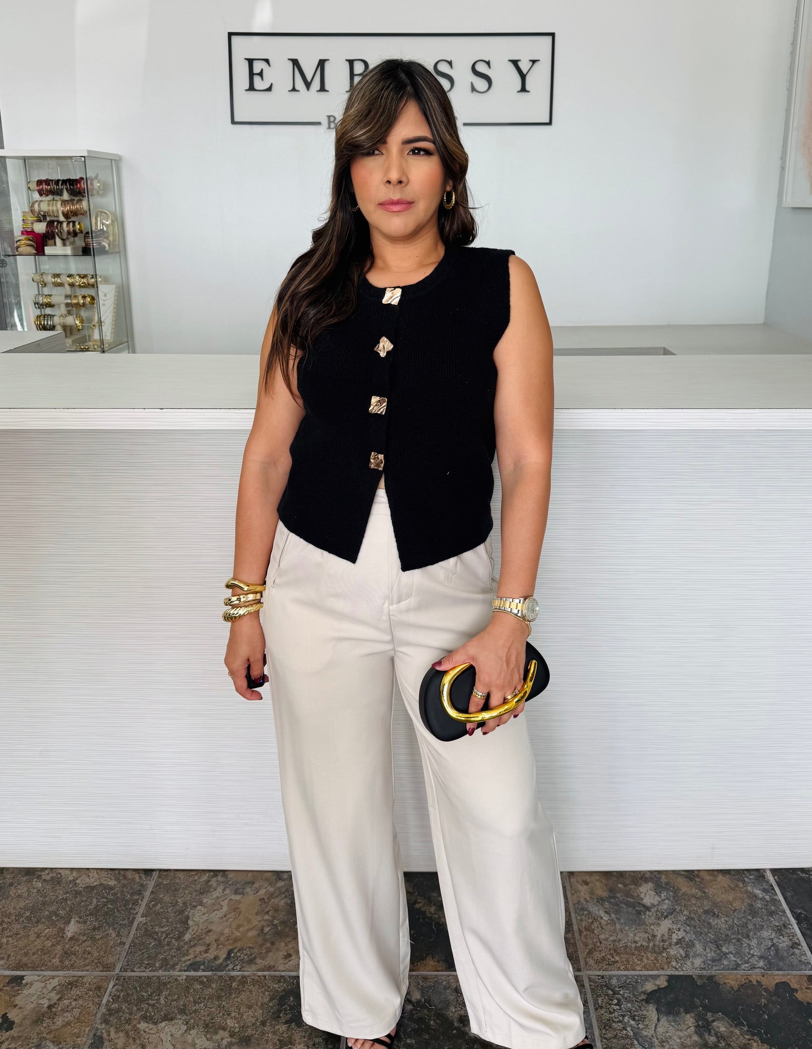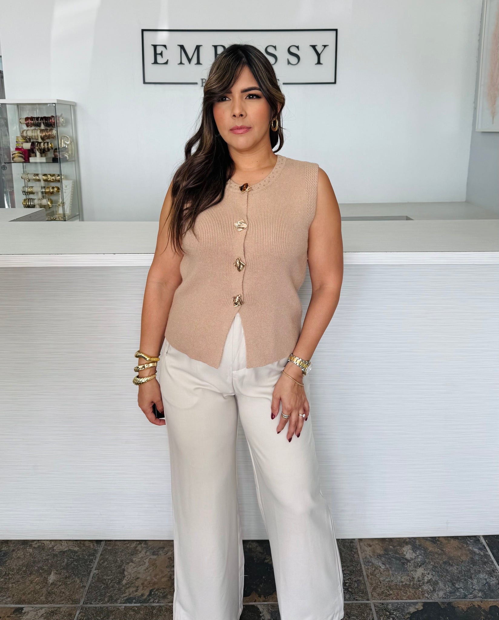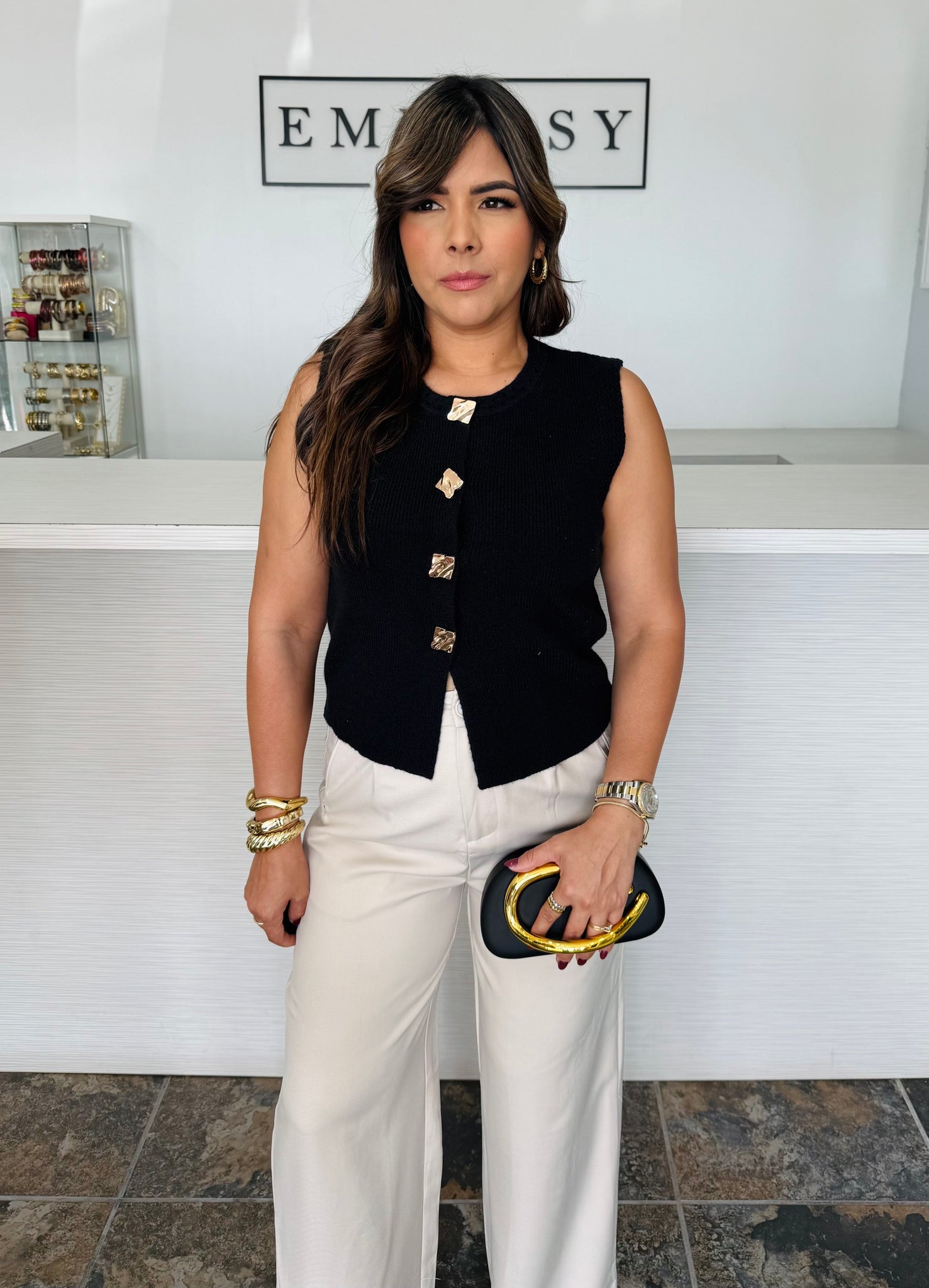 Sofisticación atemporal con un toque moderno. El Evelynn Knit Vest está confeccionado en tejido suave tipo punto con delicado acabado trenzado en las mangas y botones dorados de textura marmoleada que elevan el diseño.