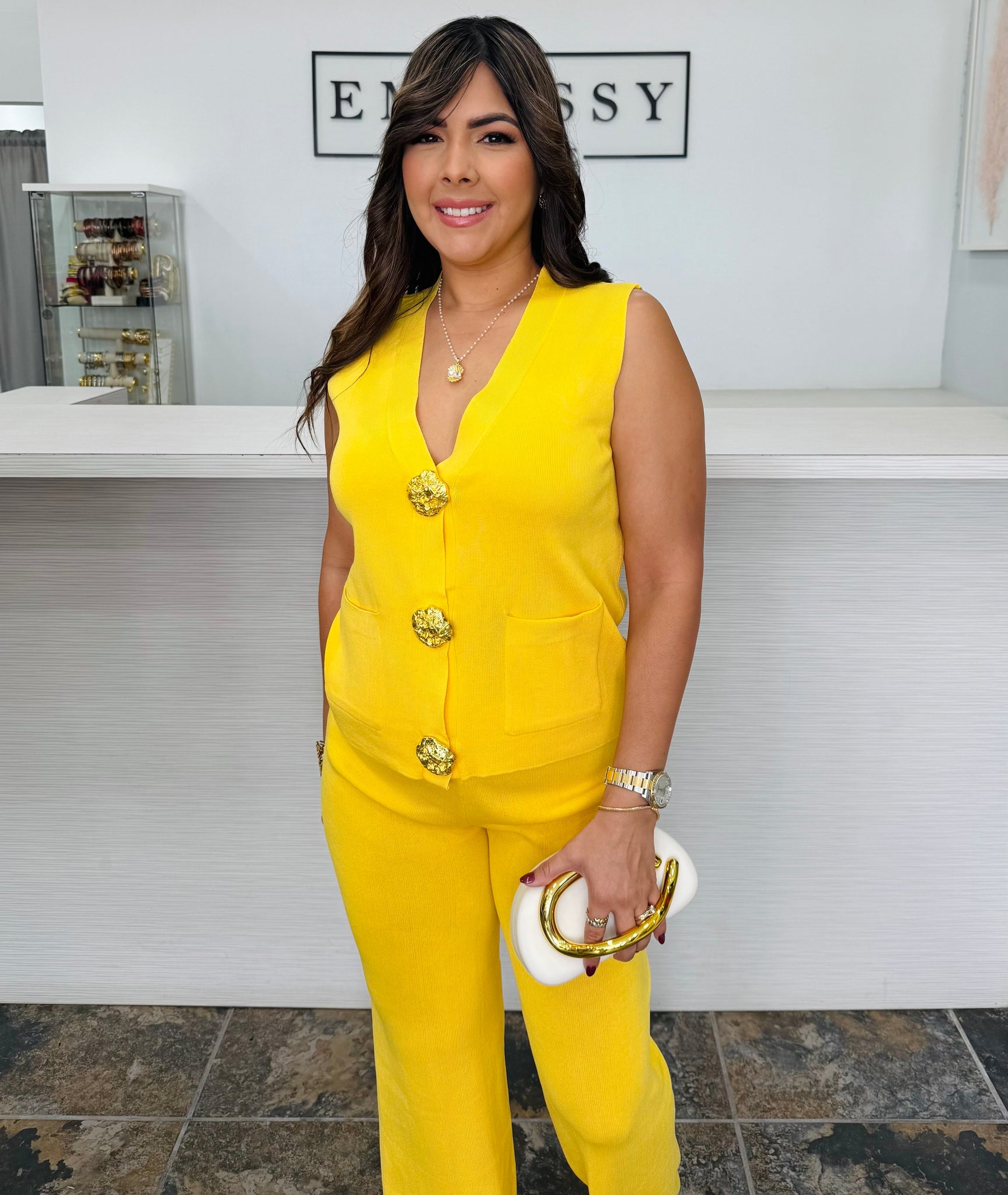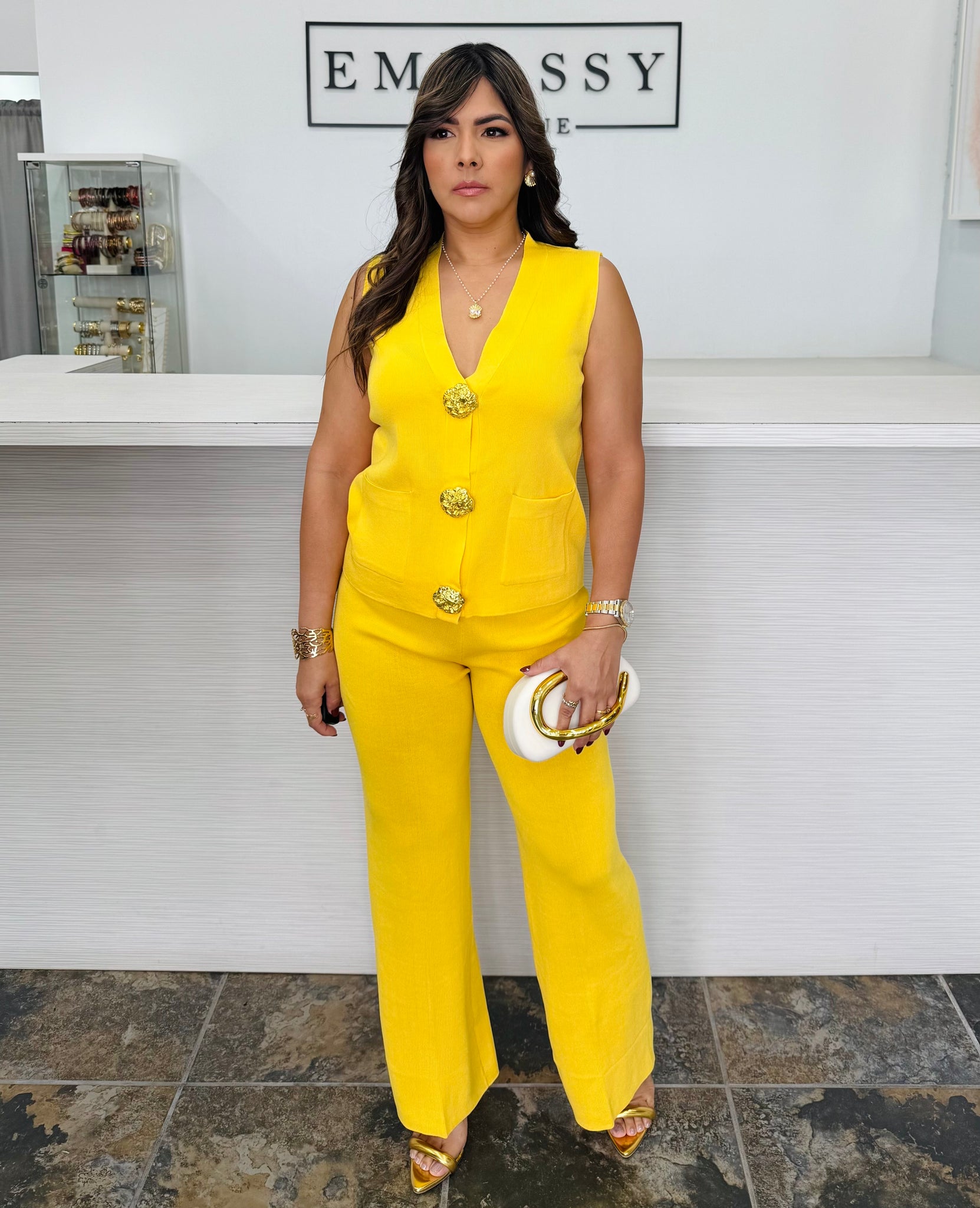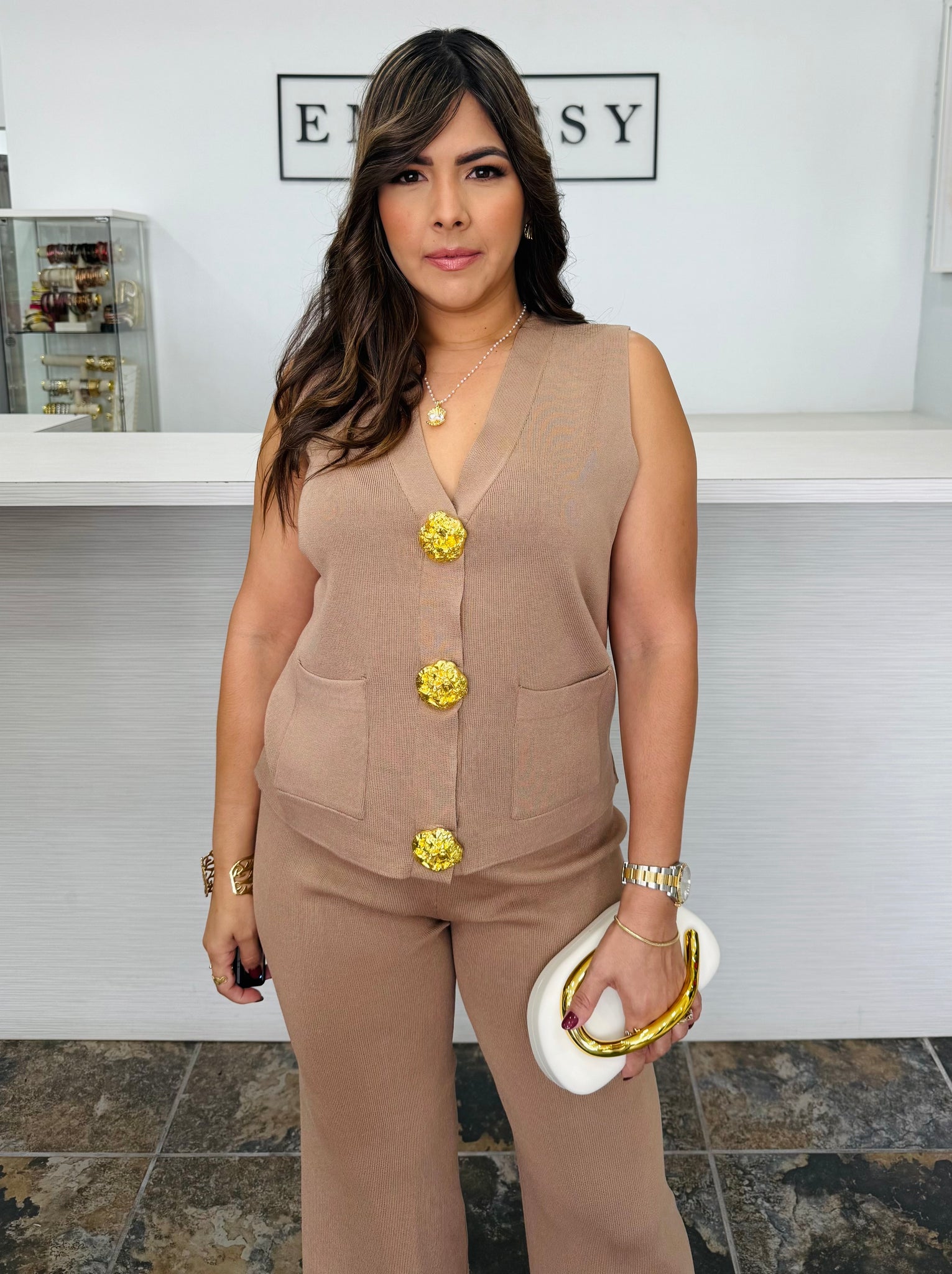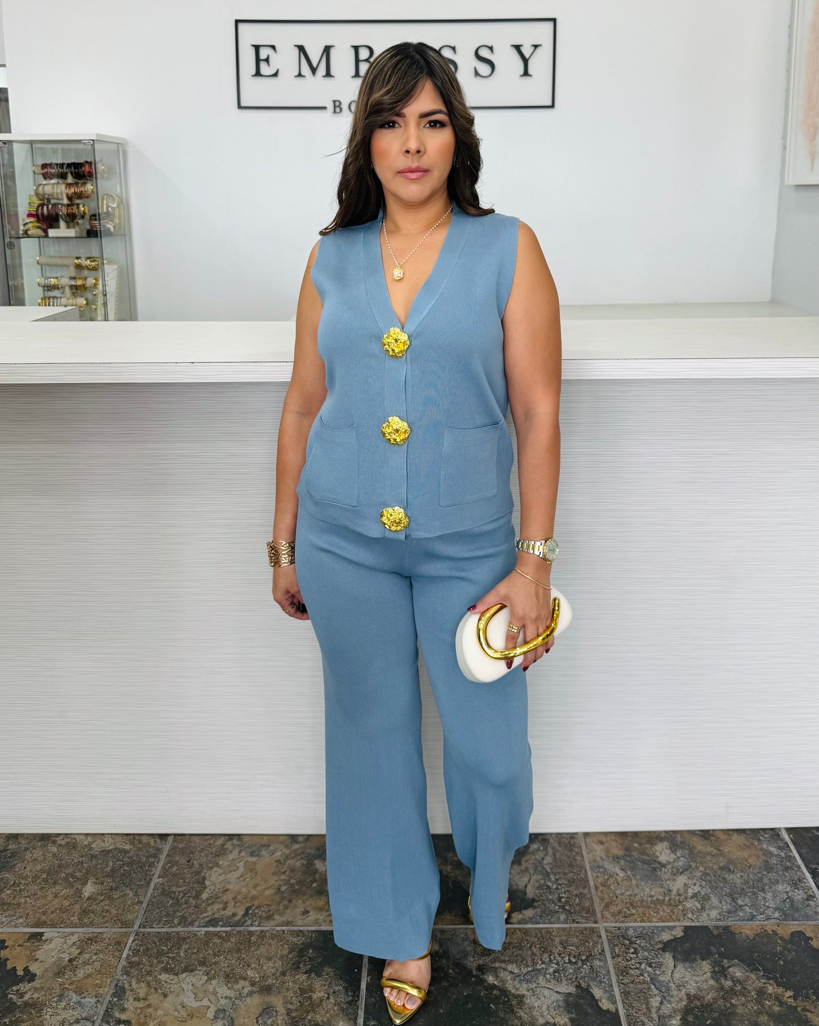 Su chaleco sin mangas y pantalón de pierna ancha crean una silueta fluida, resaltada por los botones florales dorados que añaden un toque de lujo.