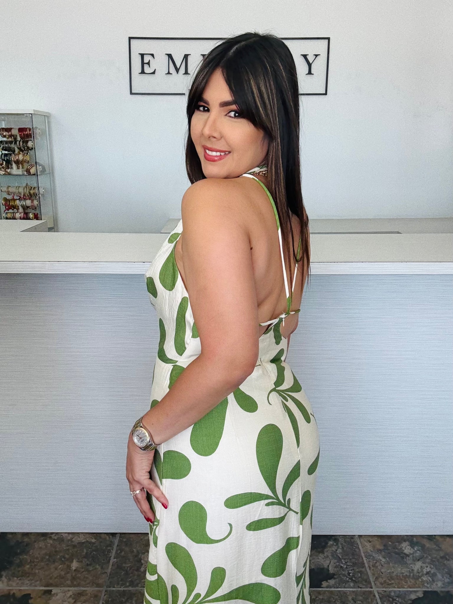Este vestido largo de escote drapeado y espalda abierta combina elegancia con un print botánico fresco en verde hoja. Su caída ligera y el corte halter estilizan tu silueta, ideal para eventos de día, cenas tropicales o vacaciones.