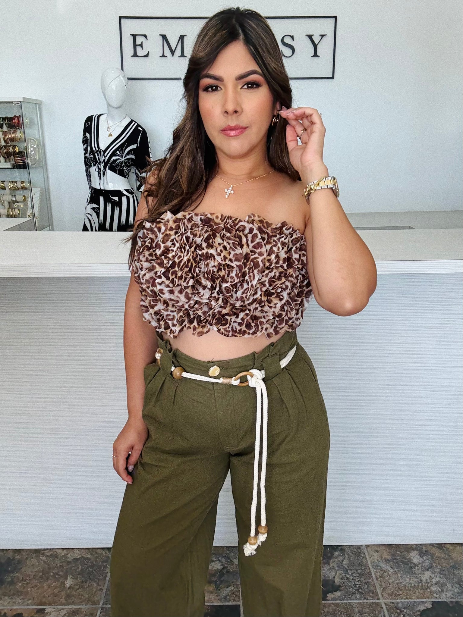 Blusa strapless con olanes en estampado animal print. Corte femenino y moderno que añade volumen y estilo al outfit. Perfecta para usar con pantalones de tiro alto o faldas para un look atrevido pero sofisticado.