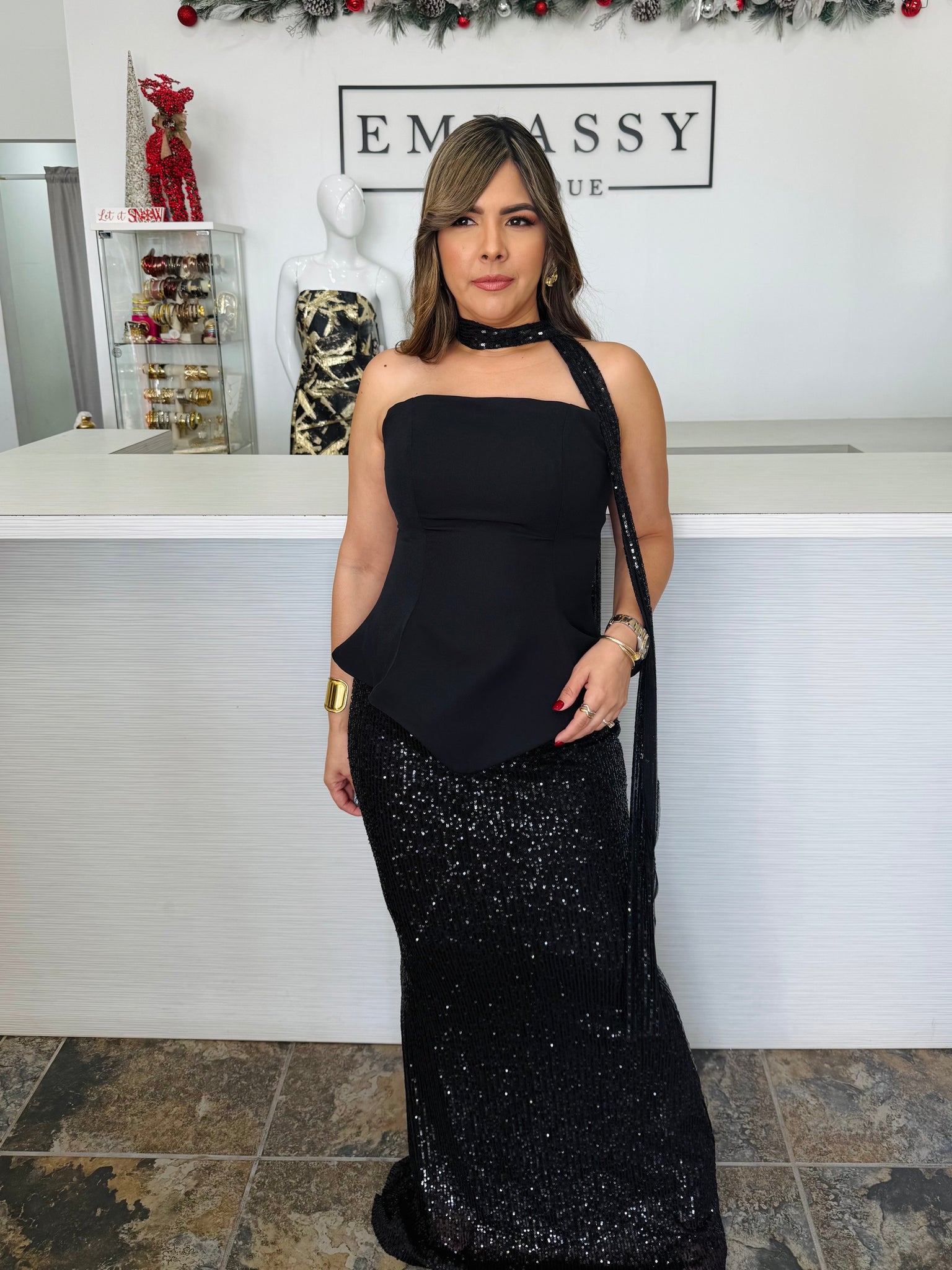 El top tipo bustier strapless tiene una estructura firme que define la silueta; no estira y corre justo, con zipper en la parte de atrás para un ajuste limpio y seguro. Incluye detalle tipo choker con cinta larga en lentejuelas que añade movimiento y un toque dramático al look.