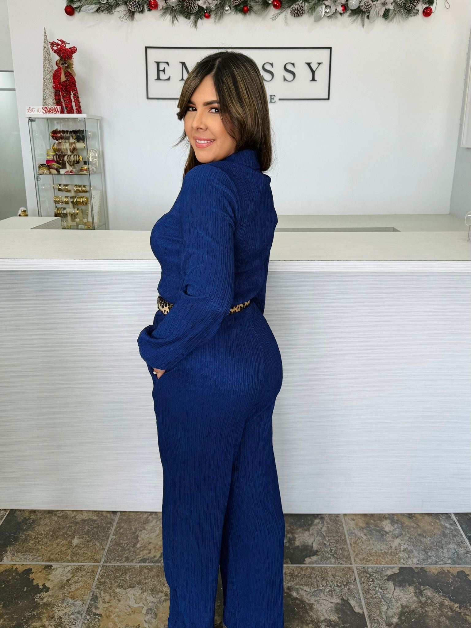Jumpsuit en tono navy con textura plisada, cuello camisero y botones frontales. Silueta cómoda y pulida, ideal para oficina, eventos o cenas. Combina hermoso con cinturones dorados, animal print o accesorios statement.