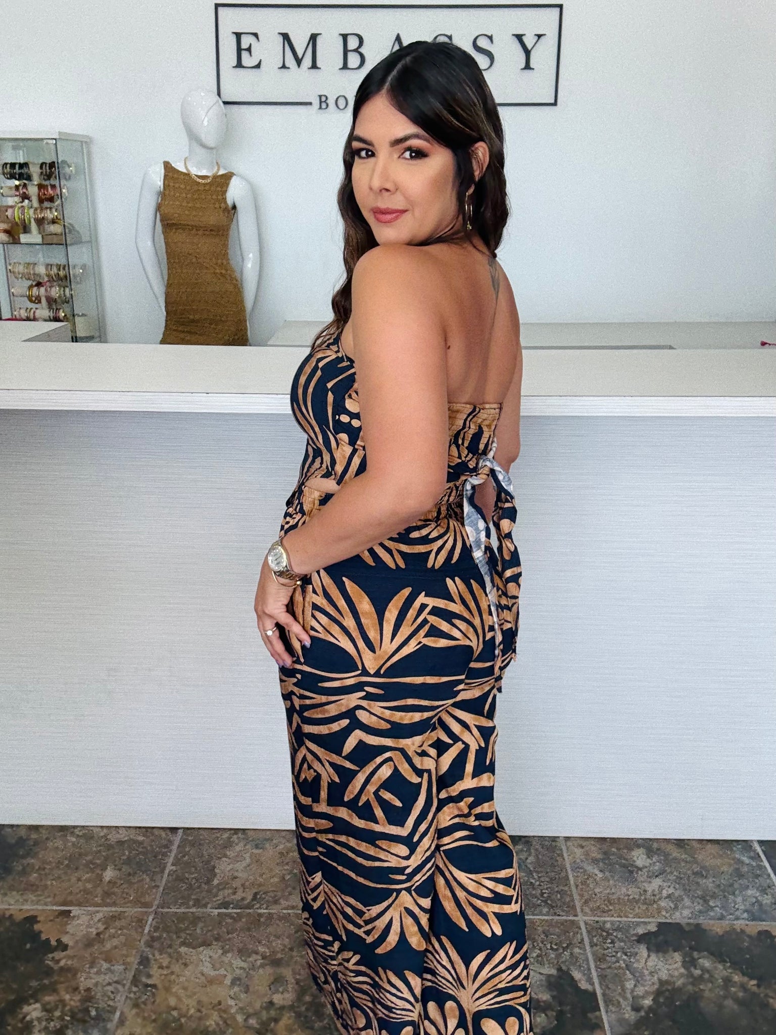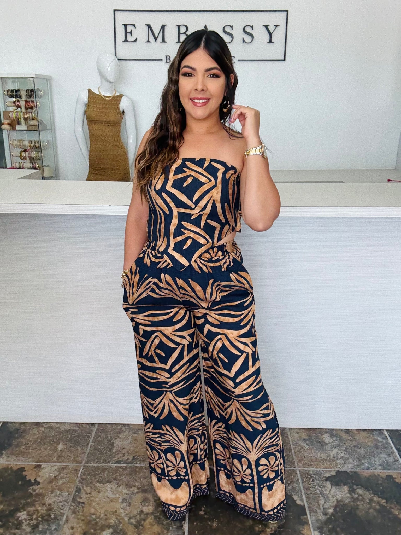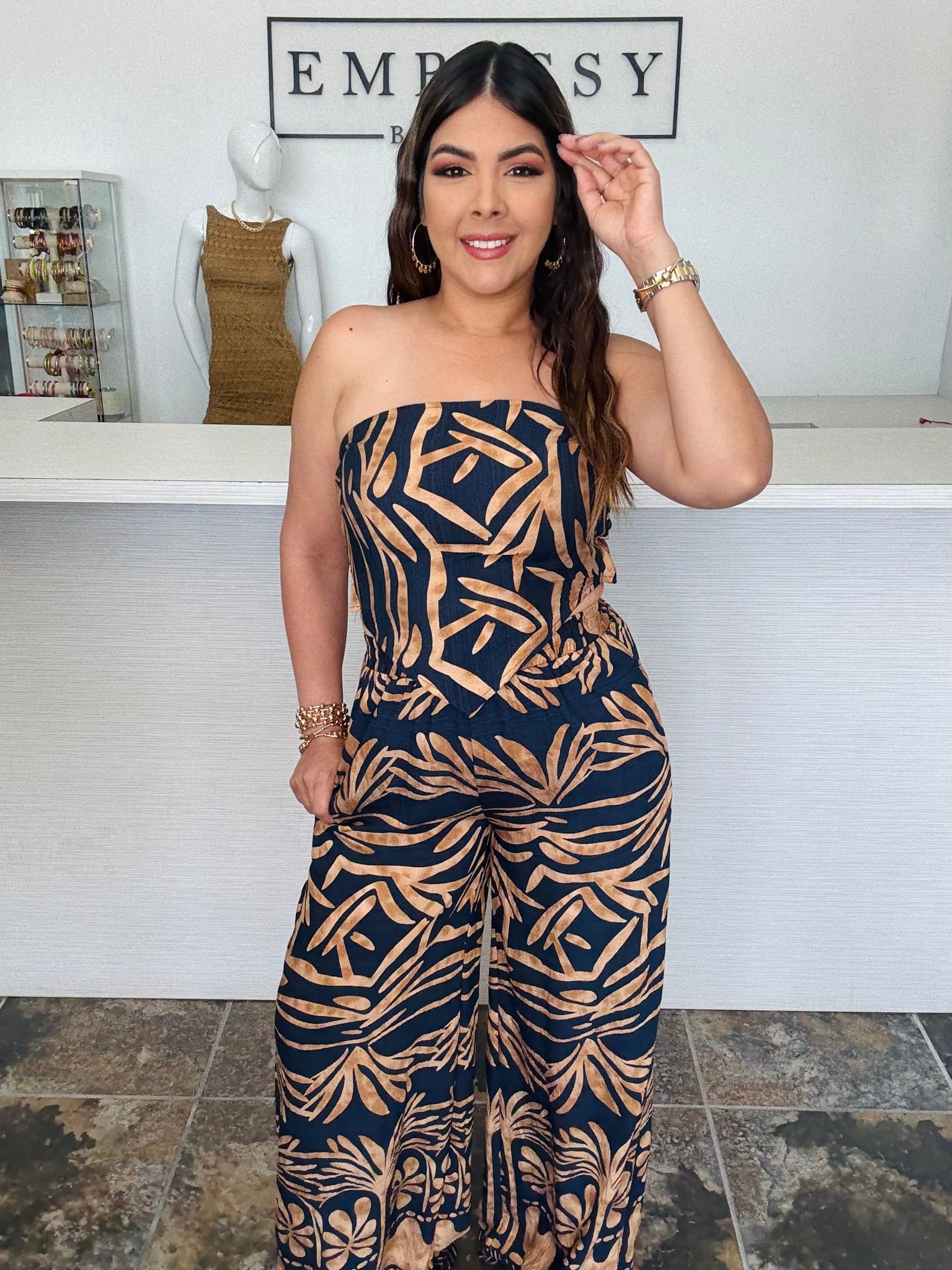 Luce auténtica y poderosa con nuestro set “Naiara”. Un conjunto strapless con pantalón palazzo de caída fluida, estampado tribal en tonos caramelo sobre fondo negro. La parte superior se ajusta con lazo posterior para un toque chic y cómodo. Perfecto para tus salidas veraniegas o tardes con amigas.