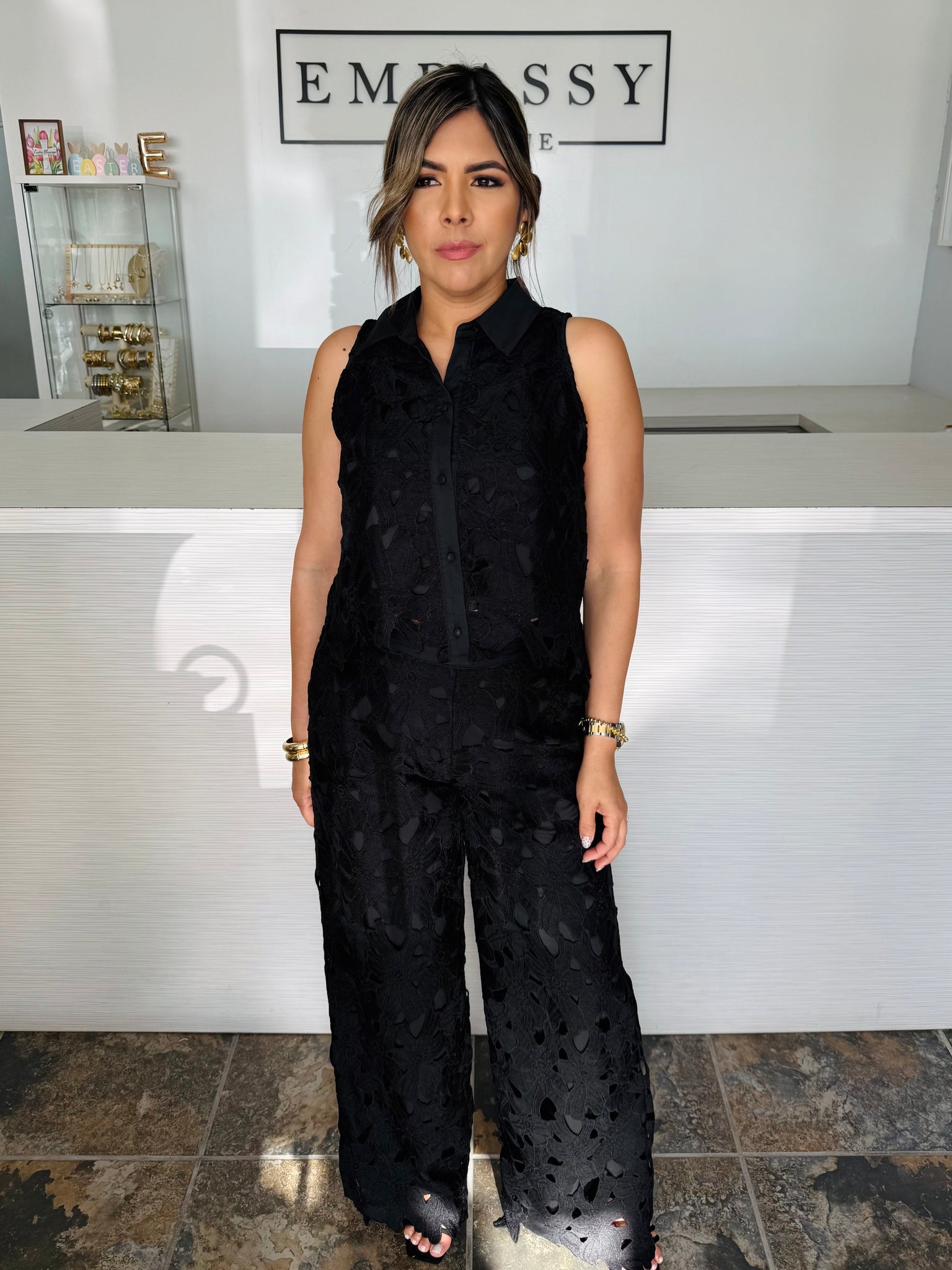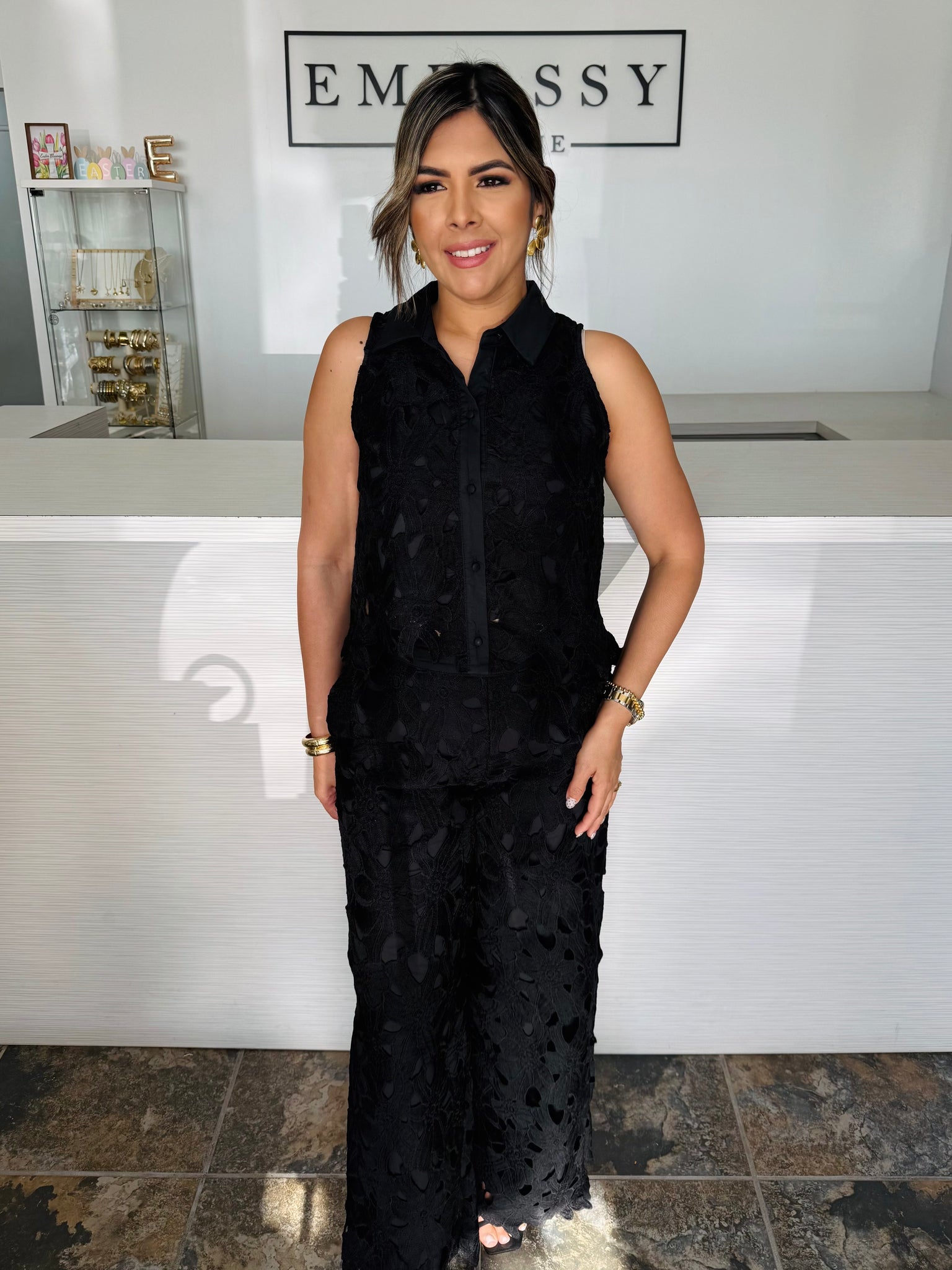 Set negro de dos piezas con textura y acabado elegante, ideal para ocasiones donde quieres verte arreglada sin complicarte.