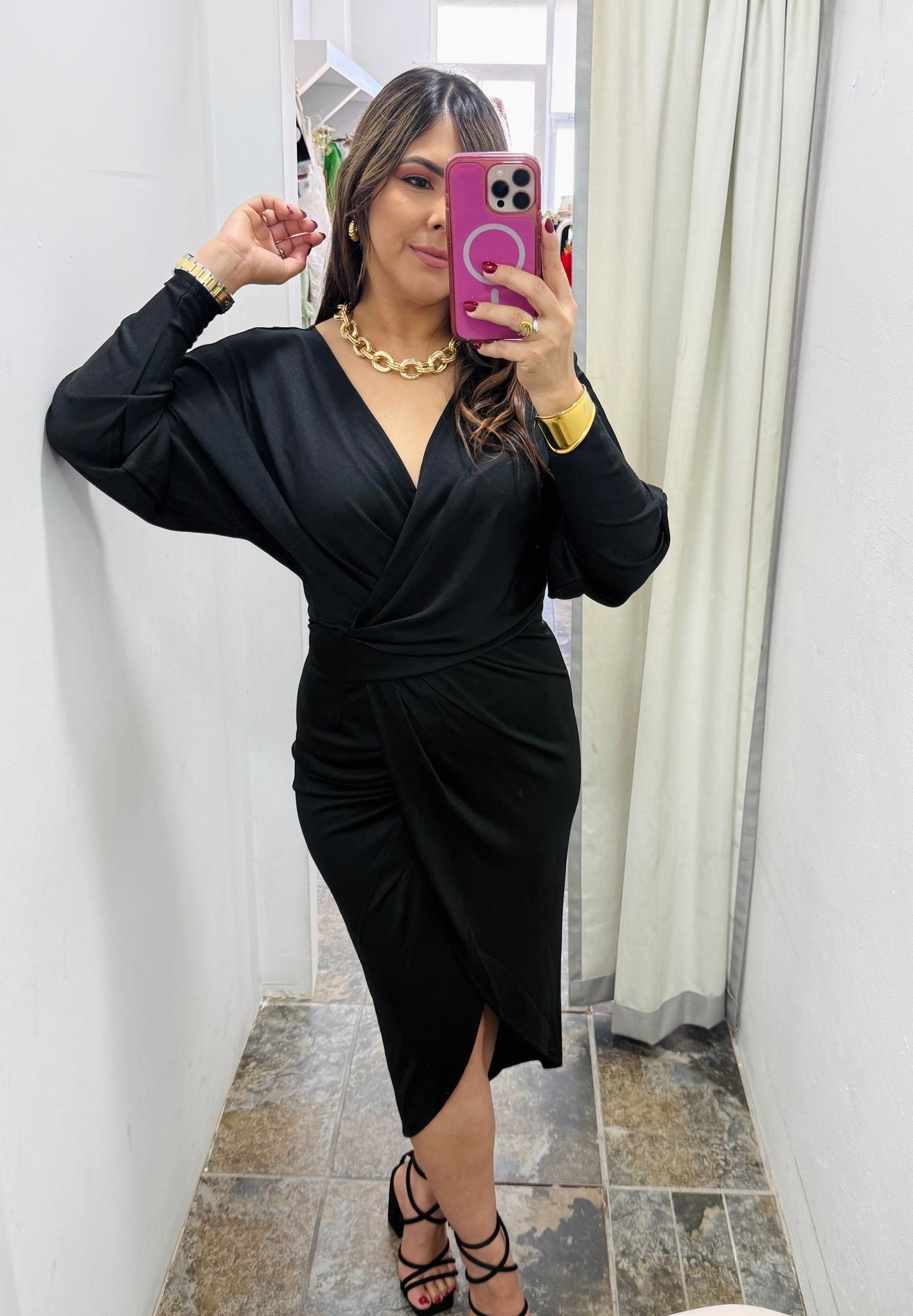 Un vestido midi negro con un corte cruzado que favorece la figura y realza la cintura sin apretar.