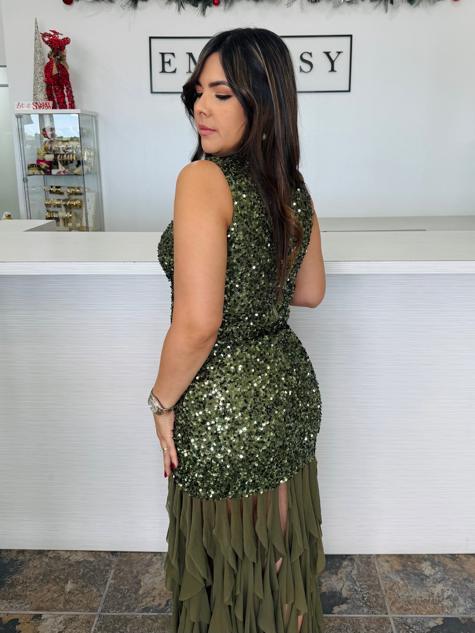 Haz una entrada inolvidable con nuestro Olive Gala Statement Dress, una pieza diseñada para robar miradas con su brillo sofisticado y su silueta elegante.