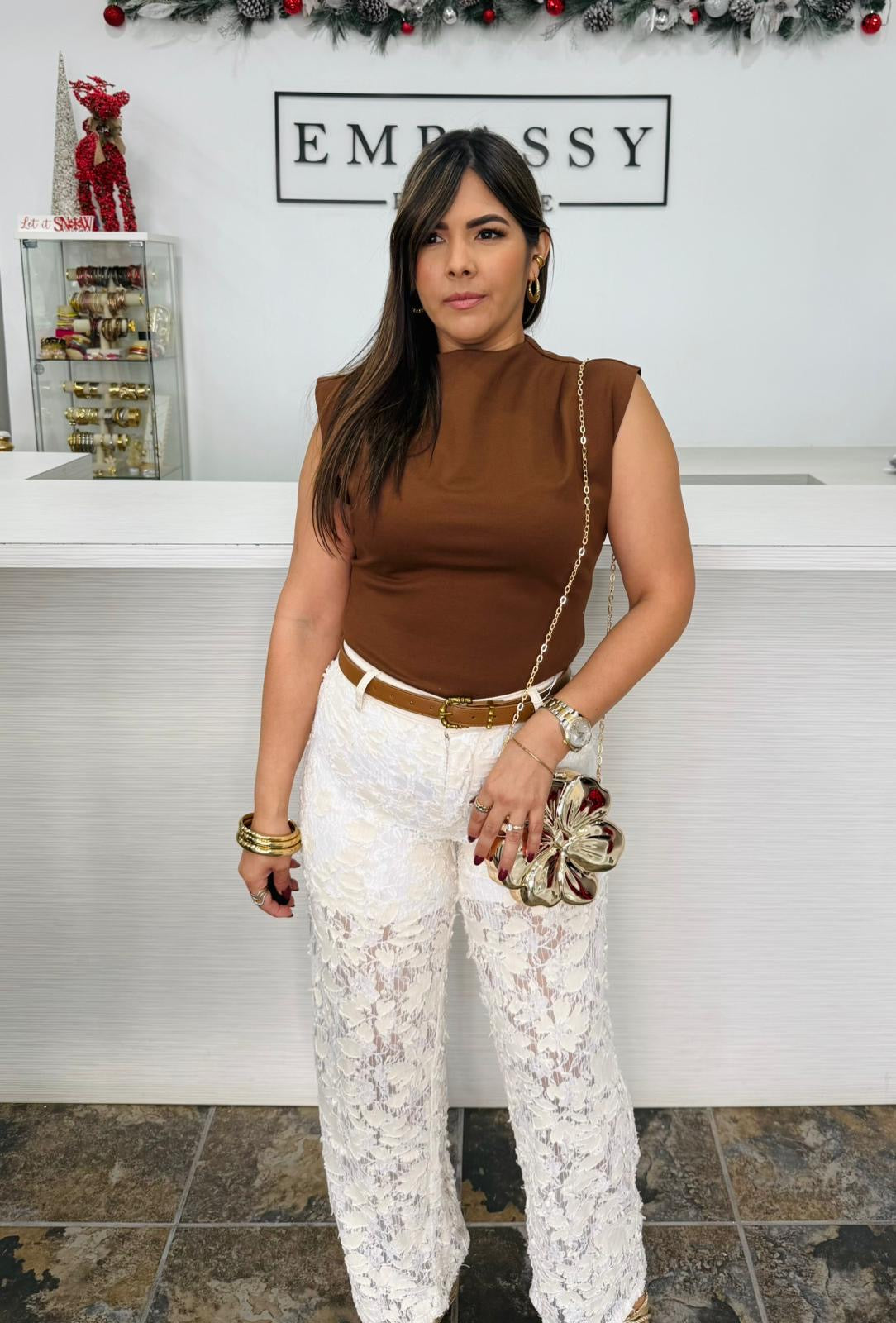 Pantalón de encaje floral con transparencia sutil y forro corto interior. Su caída recta y delicada textura lo convierten en una pieza elegante y femenina, perfecta para ocasiones especiales o estilos de día con un toque chic.
