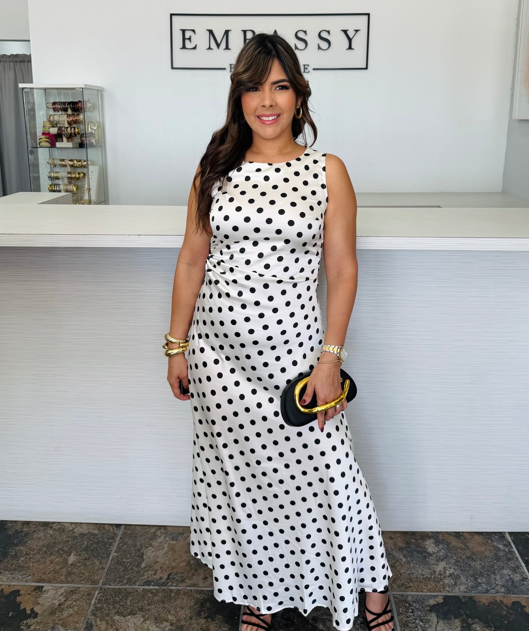 El estampado de lunares en blanco y negro revive la esencia atemporal del estilo retro, mientras su silueta fluida abraza el cuerpo con delicadeza. Incluye detalle de lazo ajustable lateral que permite jugar con la abertura y adaptar el fit a tu preferencia