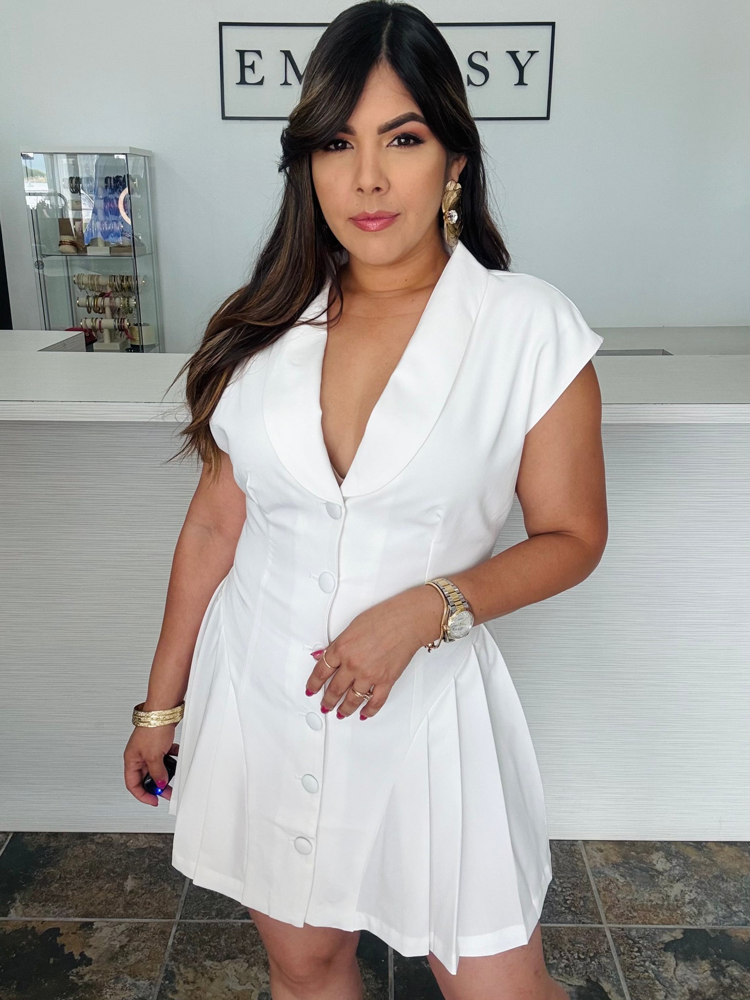 Vestido blanco tipo blazer con solapa elegante, botones al frente y pliegues tipo falda que le añaden un toque femenino y sofisticado. Una pieza ideal para eventos, cenas o para destacar con elegancia en cualquier ocasión.