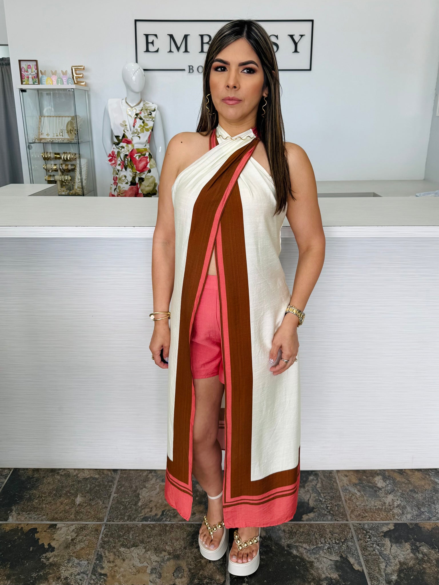 Incluye una túnica larga estilo halter que se amarra al cuello creando un movimiento espectacular, acompañada de un pantalón corto interno que brinda comodidad y seguridad al caminar.