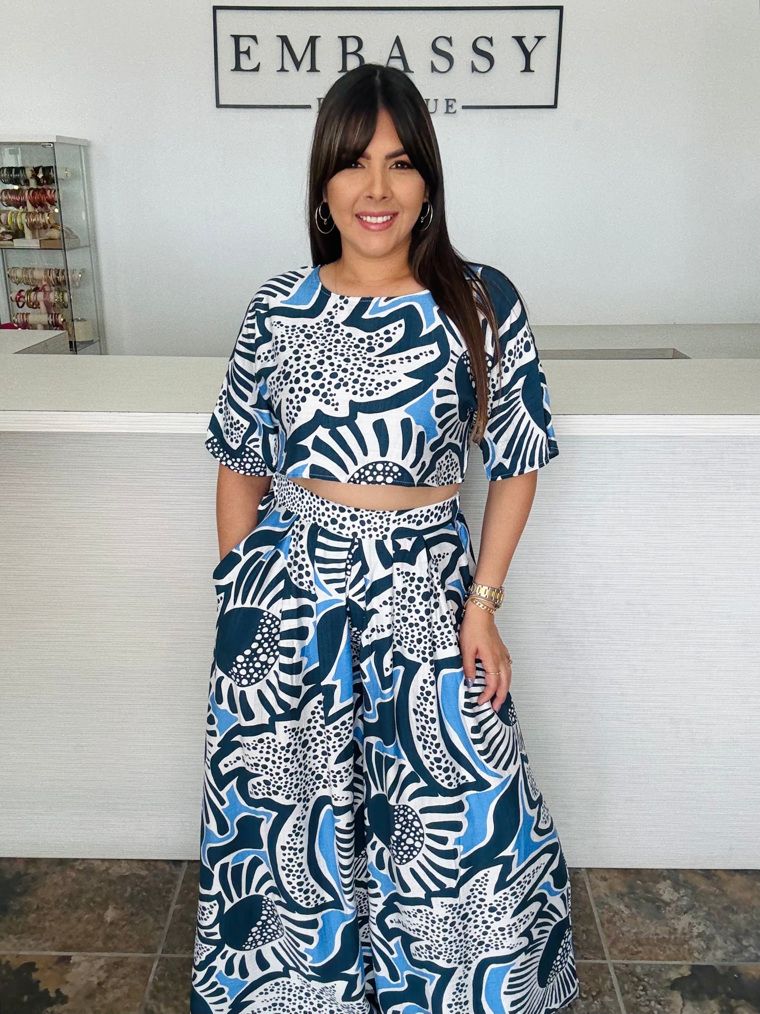 Un set de dos piezas lleno de frescura y estilo. Su estampado floral azul con toques blancos y negros roba miradas, mientras su corte amplio y liviano te garantiza comodidad y movimiento. Ideal para días cálidos o vacaciones con flow. El top tiene corte recto y manga corta, el pantalón es tipo palazzo con bolsillos.