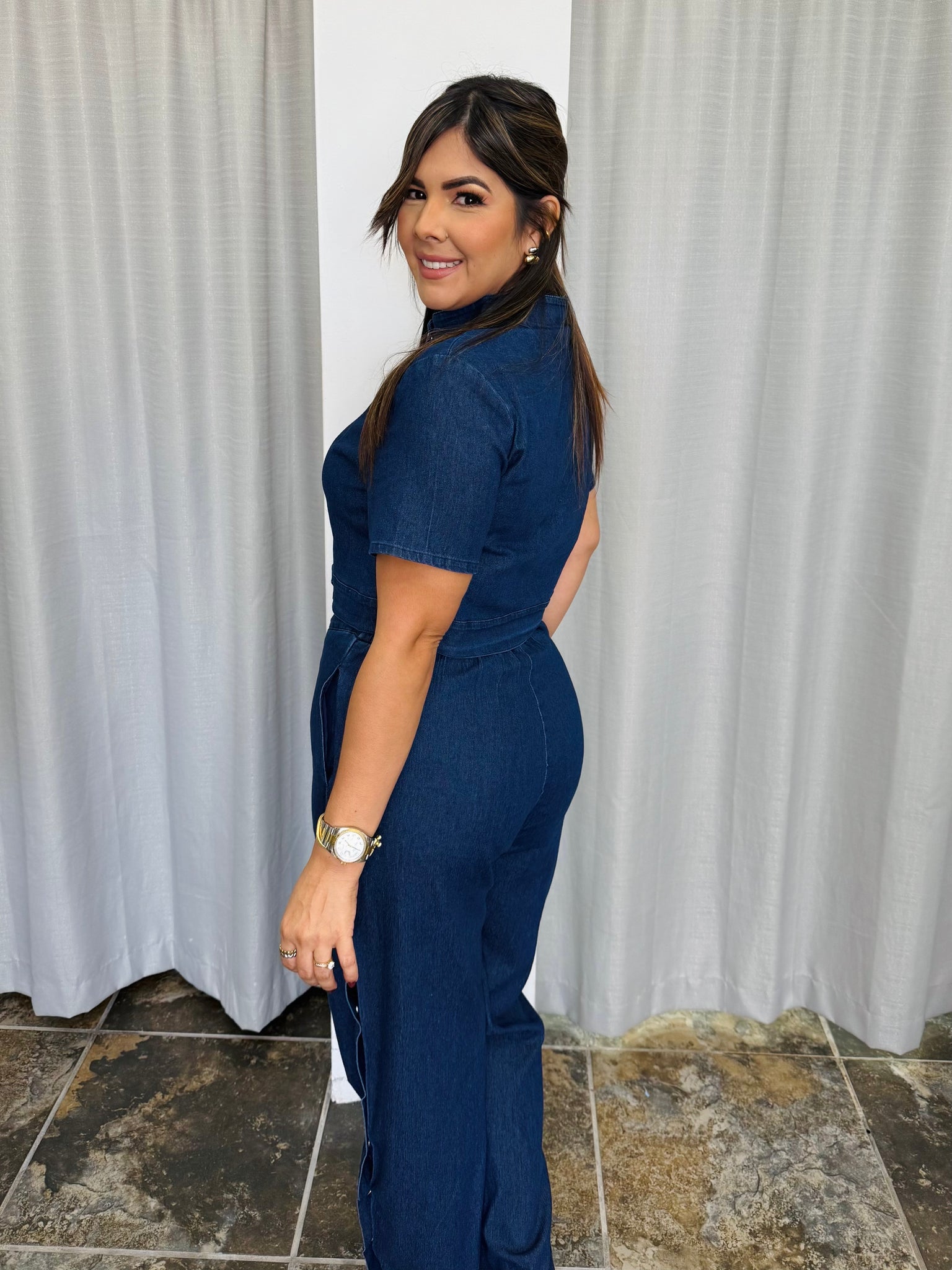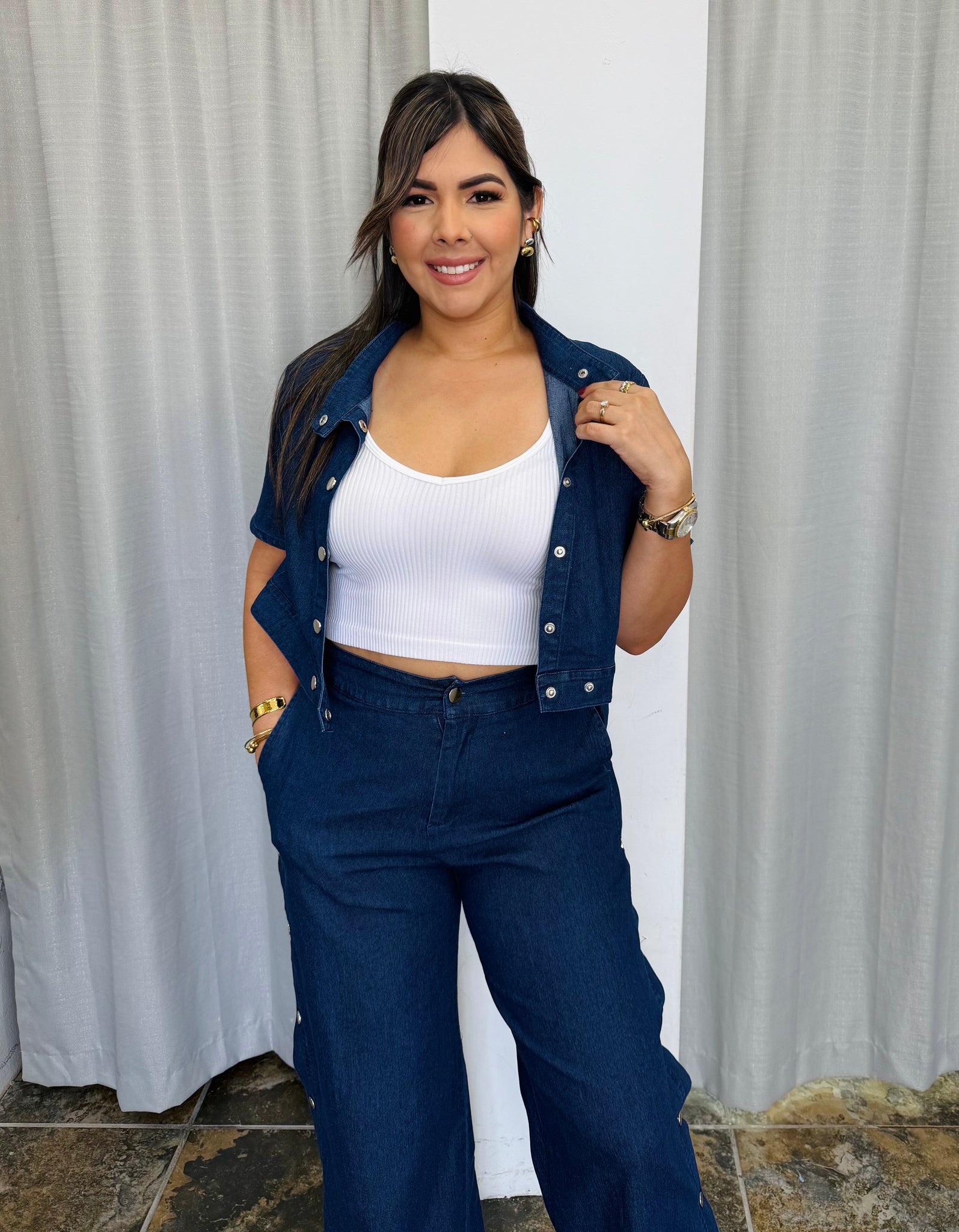 Set en mahon stretch con fit amplio y cómodo. Incluye chaquetita de botones y pantalón con detalle lateral ajustable (puedes abrir o cerrar a tu gusto). Ideal para combinar con tenis, tacos o sandalias.