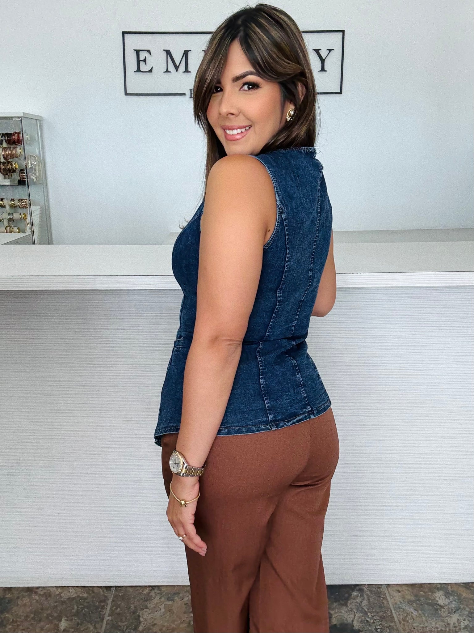 Blusa de mahón stretch con botones metálicos inspirados en el sol y la luna. Diseño entallado con costuras que estilizan la figura. Nota: corre ajustada en el área del busto.