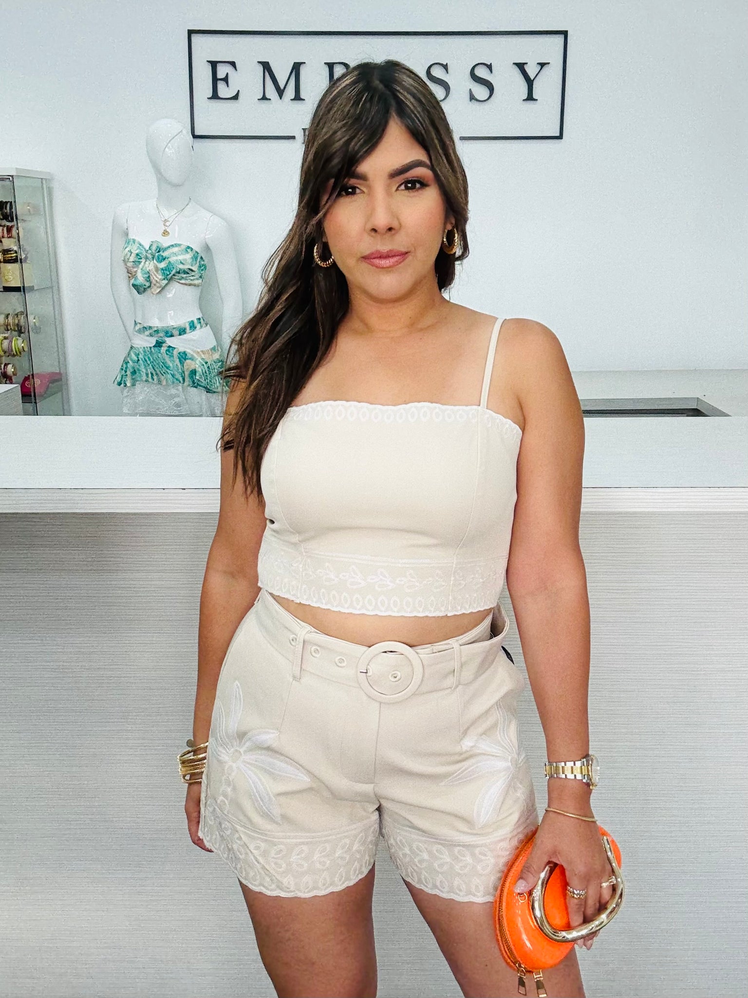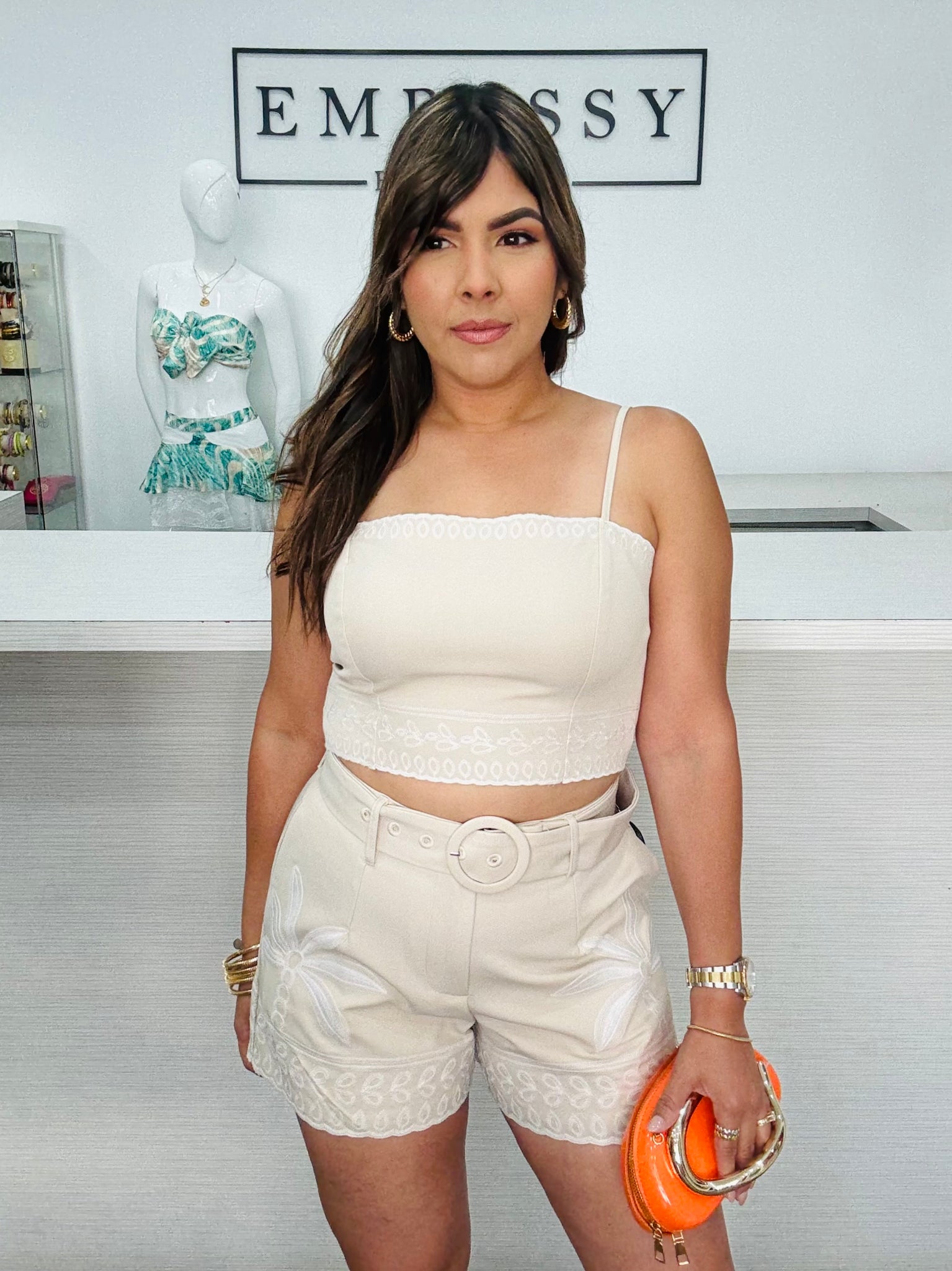 Set en tono neutro con delicados bordados florales que le dan un aire fresco y femenino. Incluye top crop de tirantes finos con detalles bordados y short de tiro alto con cinturón circular, realzando la figura de manera sutil. Ideal para ocasiones casual chic o un brunch de día. Corre al Size.