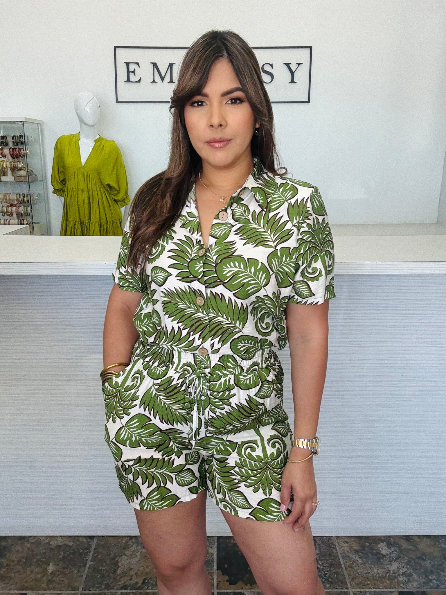 Set de dos piezas con estampado tropical en verde y blanco. La camisa es de botones, manga corta y largo versátil: úsala suelta, amarrada o completamente por dentro para simular un romper. El pantalón corto tiene elástico en cintura y bolsillos funcionales .