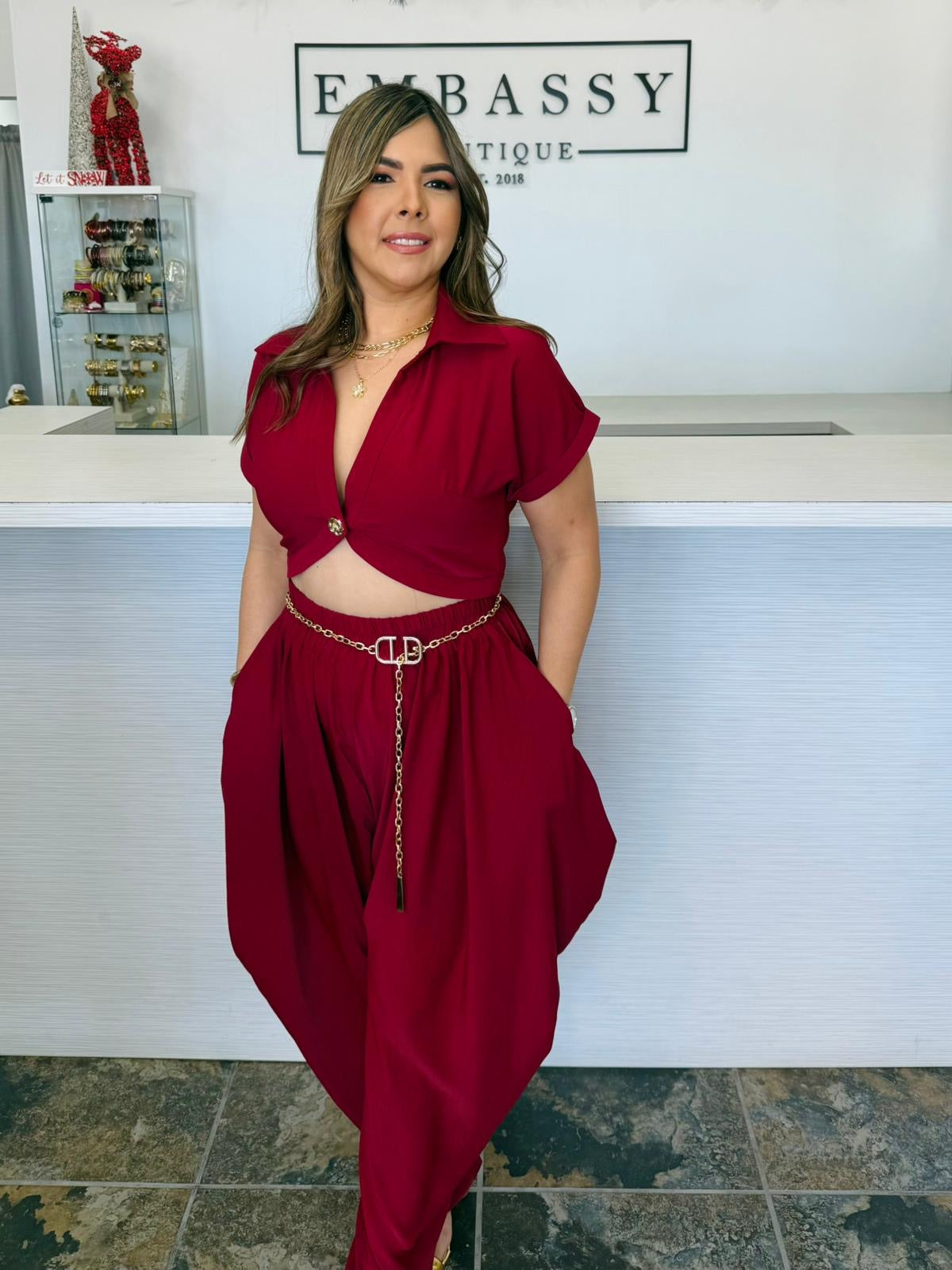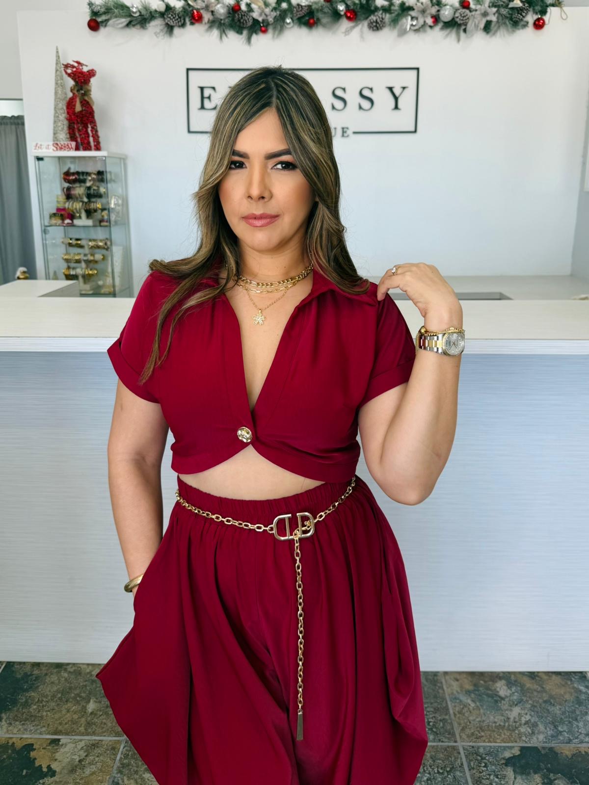 Un set con presencia, caída espectacular y un estilo moderno que eleva cualquier look. El top cropped con cuello camisero y cierre frontal añade un toque chic, mientras que el pantalón drapeado crea una silueta fluida, cómoda y estilizada.